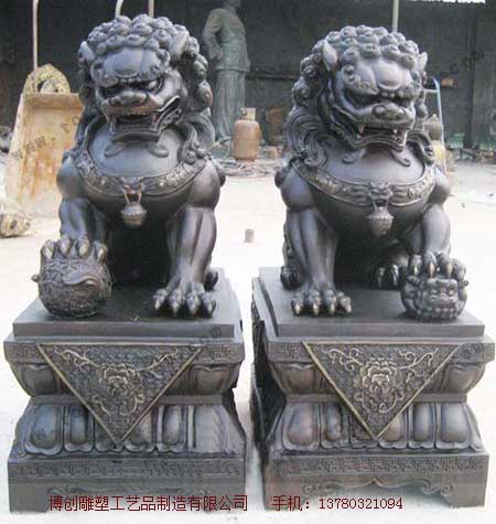 銅為金,可以克制木的刑克,遇窗戶對面可見大樹者,宜以一對銅獅子化解。銅獅子的傳入動搖了傳說中虎的威信,漸被人們視為辟邪瑞獸。加之佛教對獅子大為推崇,銅獅子也給人們心靈上的安慰"百獸之王",壓邪安吉的象征。建造的廟宇,銅獅子擺放在左邊,銅獅子擺放在右邊。銅獅子不是在正門兩側,比如坐落在廣場前,則純是裝飾取象征意義。圖為博創銅雕鑄造的故宮獅,處處體現出博創銅雕的精湛之處。