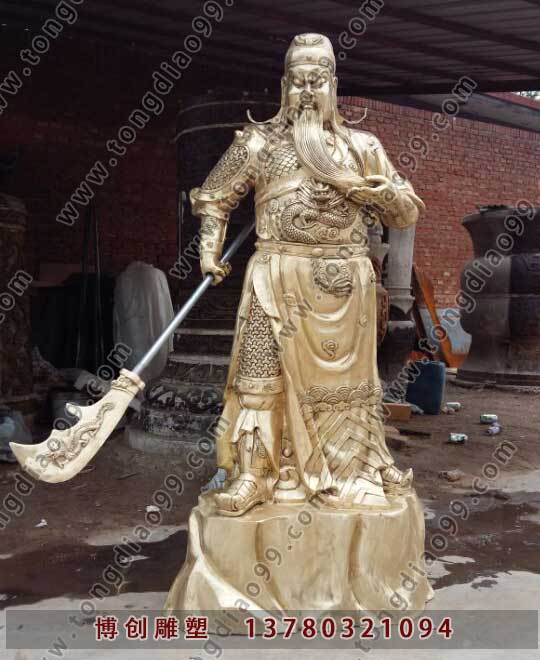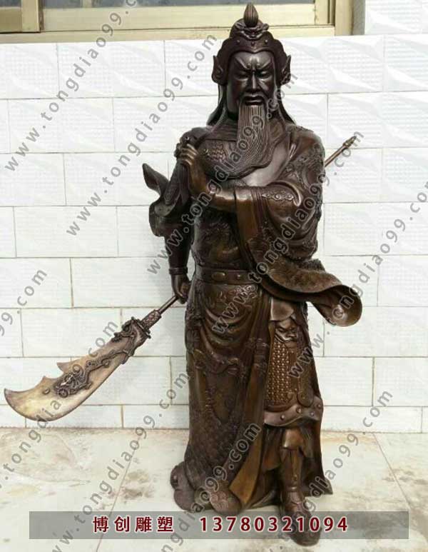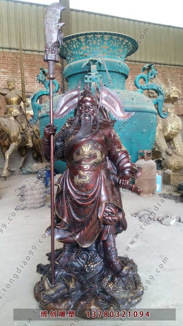 銅關公像一直是國內比較熱的雕塑作品,銅關公,博創是銅關公廠家,提供貼金銅關公,關羽(?-220)本字長生,后改字云長,河東解(今山西運城)人。東漢末年著名將領,自劉備于鄉里聚眾起兵開始追隨劉備,是劉備最為信任的將領之一。在關羽去世后,其形象逐漸被后人神化,一直是歷來民間祭祀的對象,被尊稱為“關公”;據《三國演義》描寫關羽關羽擒將圖身長九尺,髯長二尺;丹鳳眼,臥蠶眉,面如重棗,唇若涂脂,使青龍偃月刀,胯下赤兔馬,《三國志》無記載。東漢末年劉備麾下著名將領,《三國志》記載,劉備對關羽、張飛“寢則同床,恩若兄弟”,《三國演義》中則將此三人描述成了“桃園三結義”,為劉備二弟,張飛兄長。為后世傳誦。
