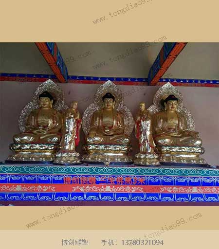 三寶佛雕塑是佛教雕塑中的重要一種,我公司提供各種銅雕佛像雕塑的鑄造,歡迎聯(lián)系洽訂。博創(chuàng)雕塑公司歡迎您!我廠佛像秉持嚴(yán)謹(jǐn)、認(rèn)真、尊重信仰的理念,做,就要做到令客戶滿意。將佛像的莊重、肅穆體現(xiàn)的淋漓盡致。我公司做為大型雕塑企業(yè),可以提供各種雕塑,歡迎聯(lián)系我們進(jìn)行訂做。三寶佛又稱(chēng)三世佛, 三個(gè)佛世界的佛。中間是裟婆世界的中央現(xiàn)在佛 釋迦牟尼佛, 左脅東方凈琉璃世界的藥師佛,右脅西方極樂(lè)世界的阿彌陀佛也稱(chēng)橫三世佛。寺廟大雄寶殿所供一般三寶佛,或者華嚴(yán)三圣。寶就是佛 寶、法寶、僧寶。佛寶是釋迦牟尼佛,法寶即四諦圣法,僧寶就是最初被度的五比丘。根據(jù)大乘佛教的說(shuō)法,人人可以成佛,佛的主要任務(wù)是度化眾生超越輪回成佛,往生西方極樂(lè)世界。三寶佛是中國(guó)廟宇中的主要神像。三寶佛在藏傳佛教中占有相當(dāng)重要的地位。