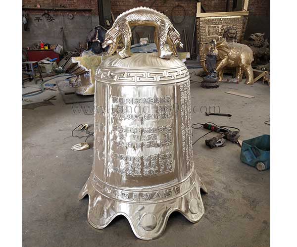 鎏金大銅鐘是銅鐘鑄造完成后,在表面高溫狀態下,將熱的金水澆到銅鐘表面,這種工藝便是鎏金。圖片中的大鐘是剛剛制成的,是車間拍的,銅鐘表面經鎏金處理后,保存時間更久,使用壽命更長。